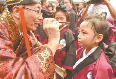 9月1日,福州市廉政文化示范点——船政衙门司仪在“入泮拜师礼”上为学生点朱砂。 新华社记者 宋为伟 摄