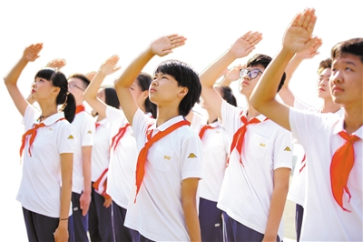 8月31日,在庄严国歌声中,北京市十一学校龙樾实验中学初一学生向国旗敬礼,拉开新学年的序幕。张一名 摄