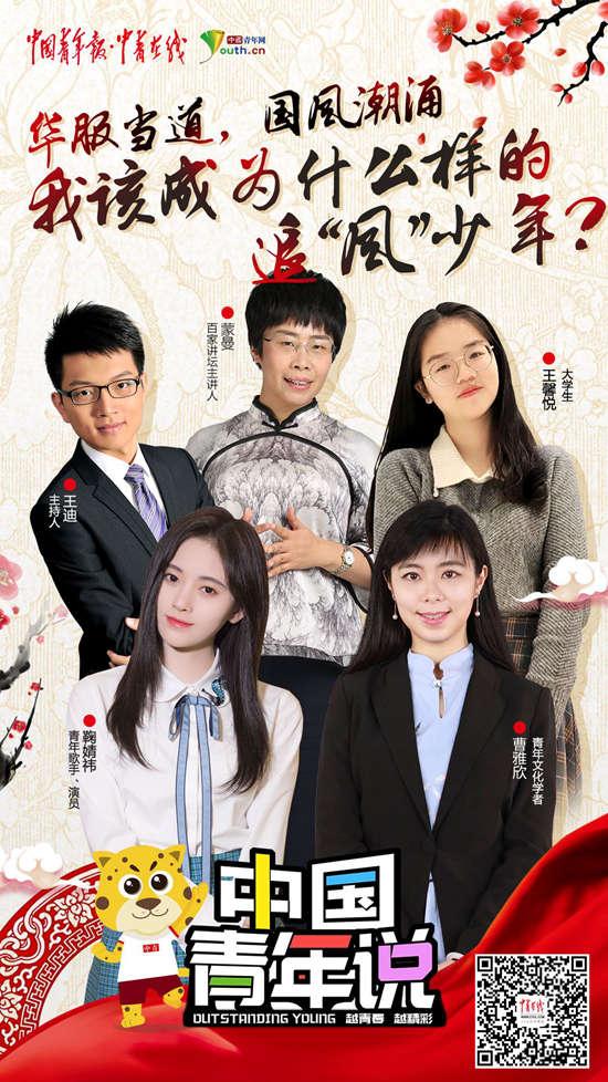 在中国青年报社强力打造的谈话类视频节目“中国青年说”中,中央民族大学教授蒙曼,青年文化学者曹雅欣,青年歌手、演员鞠婧祎,中国社会科学院大学学生王馨悦4位嘉宾畅谈自己所了解的国风元素,探讨青年面对国风潮的选择与传承。