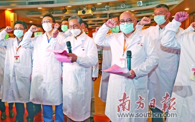 3月2日,广东省驰援武汉医疗队16名一线医护人员火线入党。图为广州医科大学附属第一医院举行首批战“疫”一线发展党员的入党宣誓仪式,钟南山院士领誓。两名新发展预备党员在武汉通过远程视频,面对党旗庄严宣誓。