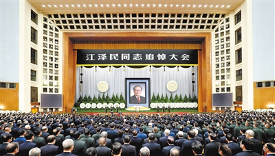 今天,我们在首都人民大会堂隆重举行追悼大会,极其沉痛地悼念敬爱的江泽民同志。