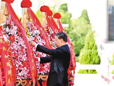 习近平迈步上前,仔细整理花篮缎带。随后,习近平等党和国家领导人缓步绕行,瞻仰人民英雄纪念碑。