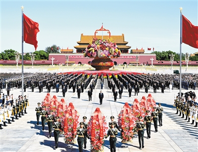 方阵前,以中共中央,全国人大常委会,国务院,全国政协,中央军委,各民主党派、全国工商联和无党派爱国人士,各人民团体和各界群众,老战士、老同志和烈士亲属,中国少年先锋队名义敬献的9个大型花篮一字排开,花篮红色缎带上书写的“人民英雄永垂不朽”格外醒目。
