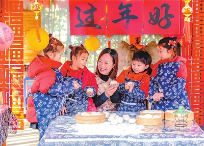春节将至,江苏省南通市通州区金洲幼儿园开展“做馒头 迎新年”活动,组织孩子们参与揉面、塑形、蒸制直至出笼、点红印等馒头制作的全过程,体验春节传统习俗。图为小朋友跟老师学做馒头。 翟慧勇 摄