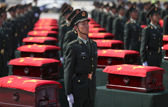鲜艳的五星红旗覆盖在棺椁上,117名礼兵护送棺椁来到摆放区。灿烂的阳光下,庄严肃立的中国武警卫士军乐团奏响《思念曲》,现场全体人员脱帽,向烈士遗骸三鞠躬。