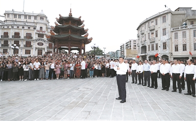 习近平来到二层檐廊,举目远眺,韩江水阔,长桥卧波。在听取广济楼历史和古城修复保护情况汇报后,习近平强调,包括广济桥、广济楼在内的潮州古城比较完好地保留了下来,实属难得,弥足珍贵。在改造老城、开发新城过程中,要保护好城市历史文化遗存,延续城市文脉,使历史和当代相得益彰。