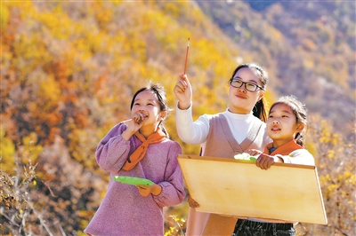 近日,河北省邢台市内丘县獐么中心小学教师在黄岔村指导学生绘画。深秋时节,该校美术社团的学生走出教室来到户外,以“山村秋日”为主题,用画笔描绘家乡斑斓秋色,感受秋天的气息。