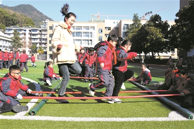 进入冬季,作为杭州市传统体育特色学校,建德市新安江第一小学根据各年级学生成长的特点,开展传统体育项目,乐享运动。图为师生们一起跳竹竿舞。 宁文武 摄