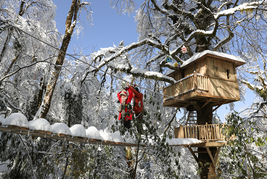 1月13日,来自四川省荥经县胡长保小学的小学生在熊猫森林国际探索学校老师指导下通过前往树屋的悬索。新华社记者 江宏景/摄