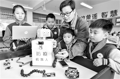 近日,在浙江省湖州市长兴县实验小学机器人实验室,师生正在调试防疫机器人。长兴县实验小学师生创客团队运用3D打印、物联网编程等科技手段自主研发防疫机器人,搭载体温自动监测预警、防疫知识智能播报等功能,助力校园防疫,确保师生安全。