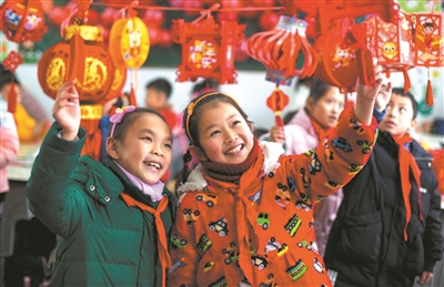 1月26日,江苏省海安市城东镇西场小学学生在观赏同学们制作的花灯。当日,江苏省海安市城东镇西场小学举行“巧手做花灯 红火迎新年”主题才艺展示活动,孩子们用自己的巧手制作出各式花灯,迎接新春佳节的到来。