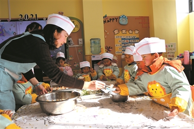 日前,云南省会泽县中国中铁第三幼儿园的孩子们在学习做汤圆、包饺子、做灯笼、剪窗花、贴春联……该园抓住生活中的每一个契机,引导孩子们多角度、多方式、多渠道了解传统节日的来历和习俗。新年到来之际,在全园各班教师的教、传、帮之下,孩子们通过学、做、吃,逛、赏、玩,感受新春佳节的热闹气氛。图为孩子们在学习包饺子。