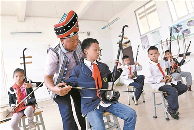 | 民间艺人在云南砚山县平远镇第二小学指导学生演奏二胡。该校开设30多门文化教育课程,培养学生文艺修养,打造健康快乐校园。 新华社发 |