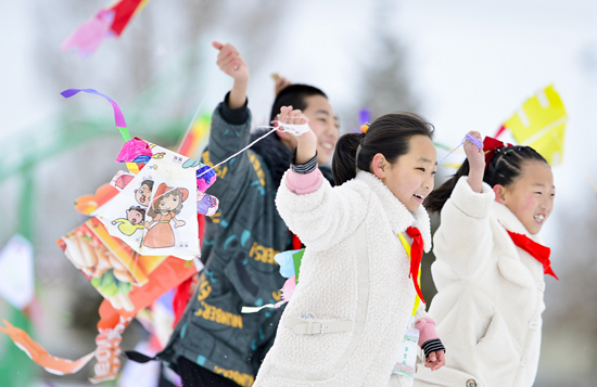 2月28日,呼和浩特市赛罕区黄合少镇第一中心校学生放飞风筝。当日,内蒙古自治区呼和浩特市赛罕区黄合少镇第一中心校举办“放飞纸鸢 童心逐梦”主题活动,师生踏着春雪,放飞寒假里自制的风筝,开启新学期。王正/摄(新华社发)