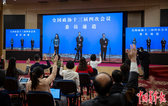 3月10日,全国政协十三届四次会议第三场“委员通道”上,(屏幕内左至右)全国政协委员、中国侨联常委蔡黄玲玲,全国政协委员、澳门特别行政区行政会委员张宗真,全国政协委员、台盟中央秘书长潘新洋接受记者采访。当日下午,全国政协十三届四次会议迎来闭幕会,闭幕会前举行最后一场“委员通道”采访活动。 中青报·中青网记者 李峥苨/摄