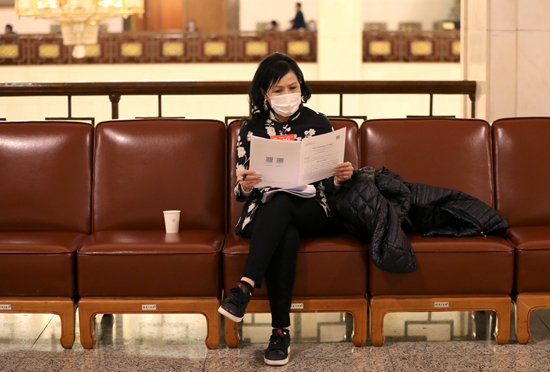 3月8日,十三届全国人大四次会议在北京人民大会堂举行第二次全体会议。会前,列席会议的一位全国政协委员在翻阅最高人民检察院工作报告。 杨晋峰/摄