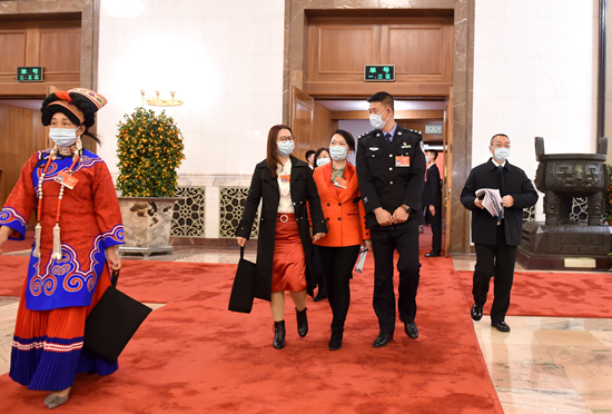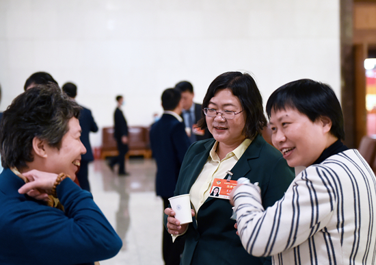 3月8日,十三届全国人大四次会议在北京人民大会堂举行第二次全体会议。会议结束后,两位女代表和一位男代表一边交流,一边走出会场。 杨晋峰/摄