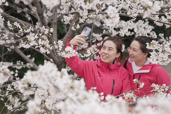 正值春暖,朵朵洁白、粉红的樱花缀满枝头,温润如玉,灿若云霞,引人流连。医护代表们不时驻足,拍照留念。