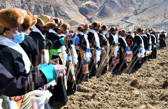 3月16日,西藏拉萨市达孜区塔杰乡妇女在播撒种子。