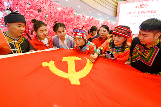 3月16日,浙江省湖州市长兴县雉城街道的党员正在绣党旗。当日,雉城街道组织辖区百名党员共绣党旗,并通过集体宣誓、唱红歌等方式,向建党100周年献礼。谭云俸/人民视觉