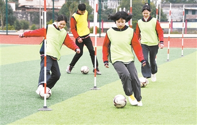 2月24日,湖南省永州市江永县松柏瑶族乡黄甲岭学校的学生们在足球场上开展足球训练。为促进“双减”政策落地,该县中小学大力开展丰富多彩的文体、科技类活动,促进孩子们健康快乐成长。