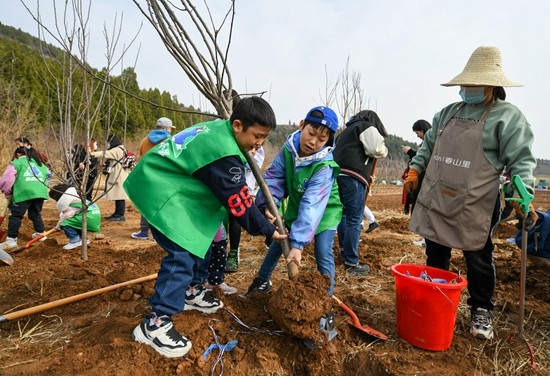 当日,在位于燕山山脉东部的天津蓟州东后子峪采石场旧址,来自12个家庭的15名孩子在家长和工作人员的帮助下参加春季植树劳动,为“地球伤疤”做“绿色美容”。