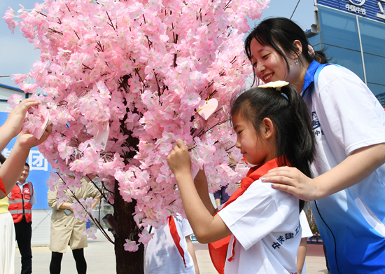 5月29日,中铁建工白沙湾足球基地项目工地,一名小女孩在“知心姐姐”陪护下系上自己的“微心愿”。当日,团青岛市委举行“益路童行 结对帮扶”主题活动。活动邀请部分农民工子女及项目周边乡镇困难儿童走进建设工地,观看演出,体验科技产品等,并帮助部分孩子实现其“微心愿”。 新华社记者 李紫恒/摄