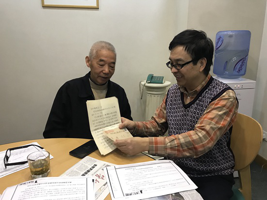 在童增的办公室里,谢老夫妇的来访,得到了索赔联合会成员最热情的欢迎。此时,最高兴的当属谢思华了,他得以亲睹自己26年前写给童增的信,他激动地说:“在修族谱的时候,我就想把这封信放进去,那时没办法联系你,以为信早就没有了。没想到我的信还保存得这么好,感谢你几十年如一日为我们四处奔走伸张正义。”