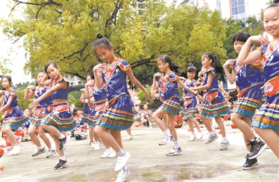 壮族的歌、瑶族的舞、苗族的节、侗族的楼,八桂共美;花山岩画、刘三姐歌谣、河池铜鼓、靖西壮锦,各展特色。每年“壮族三月三”,丰富多彩的民族文化活动,在各级各类学校次第开花、争奇斗艳。抢花炮、蹴球、高脚马、滚铁环等少数民族传统体育项目,也走进越来越多中小学的体育课堂。