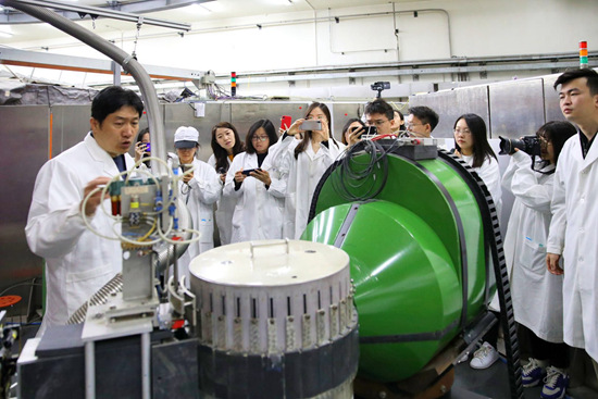 4月17日,中国原子能科学研究院核物理所所长陈东风向采访的记者们介绍相关设备。中国原子能科学研究院供图