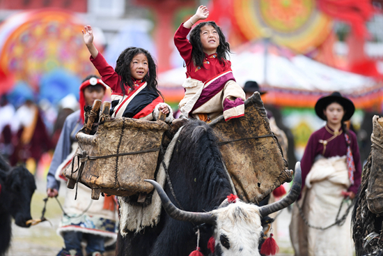 8月4日,当地群众在玉树藏族自治州成立70周年庆祝大会上表演节目。
