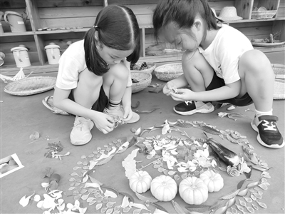 户外观鸟后,深圳市第九幼儿园中班幼儿用自然物拼出所见到的红耳鹎。陈秀丽 摄