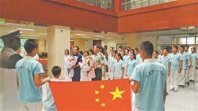 班会课最后,在罗援将军和翟志刚将军的见证下,同学们集体走到聂荣臻元帅雕像前宣誓:“忠于祖国、忠于人民。修身立德,志存高远。勤学上进,追求卓越……”