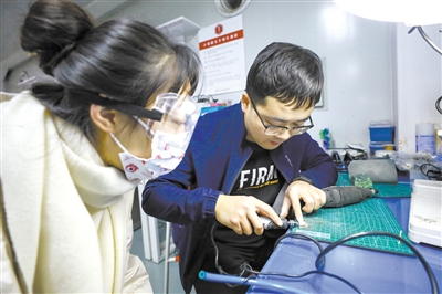 “现在,填珐琅的技术演示完了,接下来我们要自己上手填充,同学们还有什么问题?”2021年12月2日,在清华大学基础工业训练中心“个性化首饰设计与制作”选修课上,邢小颖的嗓门很大。即使现场机器轰鸣,她的声音,每一名学生都能听见。