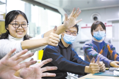 2021年12月2日,在“个性化首饰设计与制作”课堂上,学生们完成首饰抛光后展示自己的双手。双手的背后,是他们在技能和精神上的双重收获。