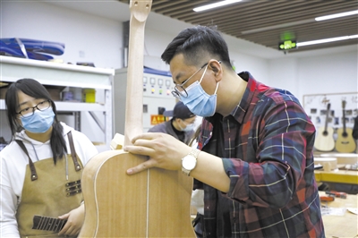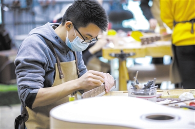 在吉他的制作实践课上,一名学生在认真制作吉他指板侧边音点部分。通过选修实践课,学生们对精益求精的工匠精神有了更加深刻的体会。