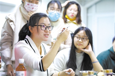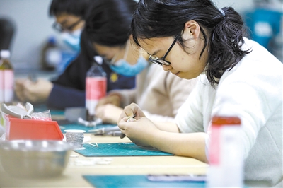 “大家看清楚啊!首饰很小,填涂色彩一定要小心,要保证上色均匀。”在清华大学基础工业训练中心,实践课教师邢小颖(前左)清亮的嗓音、趣味性的讲解以及手把手的指导,让她的课很受学生喜爱。