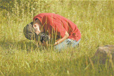 棒球帽、双肩包大约是莫非出门的标配,沉重的双肩包里装着两个相机,有时还有笔记本电脑。他走路习惯看脚下,因为野花野草大多高不盈寸,一旦发现拍摄目标,他就会弯下腰,甚至匍匐在地。