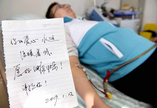在造血干细胞采集现场,来自安徽省红十字会、淮南市红十字会的志愿者和安徽理工大学的老师一起为马凯旋加油点赞。而接受捐献的异地患者则托人捎来一张纸条表示问候,上面写道:“你的爱心永远温暖着我。”