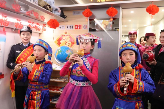 为了给春运返乡途中的“小候鸟”们营造温馨舒适的乘车环境,提升他们的出行体验,重庆客运段动车车队联合团沙坪坝区委、重庆铁路公安处,在贵阳北开往重庆西的G2884次列车上开展“动车上的少年宫”主题活动,让小“候鸟”们在返乡途中领略传统文化魅力。