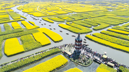 3月31日,游客在江苏兴化千垛菜花景区游览(无人机拍摄)。 近日,江苏省兴化市千垛菜花景区的油菜花次第盛开,吸引众多游客前往赏花游玩。徐劲柏/摄(新华社发)