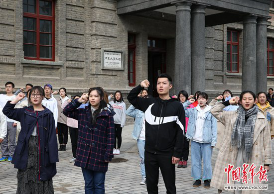 4月9日,大学生们在北京大学红楼前宣誓。当日,在中国青年报社和北京市委教育工委的组织下,来自北京第二外国语学院的50名学生在北京新文化运动纪念馆(北大红楼)前,举行主题团日活动,纪念五四运动100年,并用誓言承诺作为当代年轻人的责任与担当。中国青年报·中青在线记者 陈剑/摄