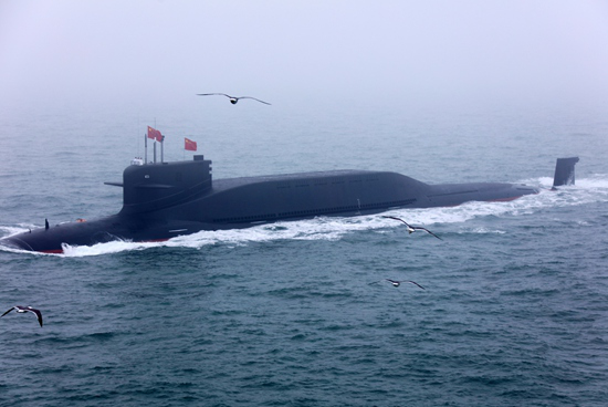 4月23日,参加海上阅兵的中国海军战略核潜艇。李唐/摄