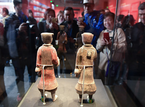 4月24日,观众在展柜前欣赏展出的文物。当日,“归来——意大利返还中国流失文物展”亮相中国国家博物馆。新华社记者 李贺/摄