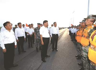 大堤上,习近平亲切看望慰问了在防汛抗洪救灾斗争中牺牲同志的家属、防汛抗洪一线人员、先进典型代表和参加抗洪抢险的部队官兵,并向全国奋战在防汛抗洪救灾一线的同志们表示诚挚的问候。他强调,今年入汛以来,南北方江河湖泊接连出现超警戒水位险情。广大干部群众和人民解放军、武警官兵坚决响应党和政府号召,发扬不怕累苦、不怕疲劳、不怕牺牲的精神斗志,坚守在防汛抗洪救灾第一线,涌现了许多先进典型和感人事迹,展现了中国人民众志成城、顽强拼搏、敢于胜利的英雄气概,书写了洪水无情人有情的人间大爱。党和人民感谢你们!