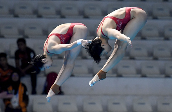 中国跳水队继续巩固自己的绝对优势。今天是本届亚运会跳水比赛第二个比赛日,继昨天掌敏洁/张家齐获得女子双人十米台冠军、曹缘/谢思埸获得男子双人三米板冠军后,今晚两枚金牌又被中国跳水队“承包”:昌雅妮/施廷懋以巨大优势拿到女子双人三米板冠军,随后出场的陈艾森/杨昊在夺金的道路上也没有遭遇实质性阻挡,他们甚至在第6轮最后一跳之前险些完成“超分”,最终以466.47分获得冠军——来到雅加达的中国跳水队和国乒队一样,又开启了“让对手绝望”的“满贯模式”。