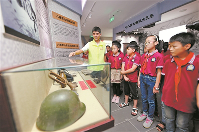 9月18日,江苏省连云港市青口十八勇士纪念馆的志愿讲解员向学生们讲解展品。当日是“九一八”事变87周年,连云港市青口中心小学组织学生来到青口十八勇士纪念馆参观学习,提醒学生们勿忘国耻。司伟 摄