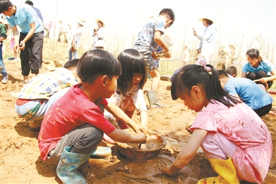近日,在位于新郑市的河南省学前教育食育实践基地——“天地课堂”,来自河南省实验幼儿园的孩子们翻花绳、斗鸡、滚铁环、跳轮胎、刺绣……玩得不亦乐乎。瞧,三个孩子正在专注地玩泥巴。当天上午,2017年河南省学前教育宣传月活动启动仪式在此举行。李见新 摄