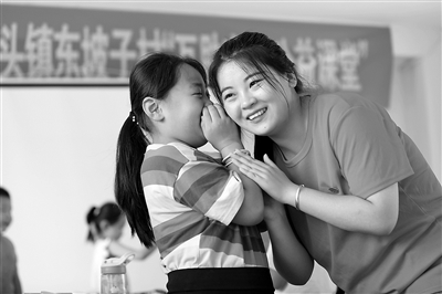 7月28日,留守儿童张钰烨和大学生张妍(右)说悄悄话。日前,山东临沂市高级财经学校9名学生志愿者,来到沂蒙山区沂南县湖头镇东坡子村,开展暑期义务支教社会实践活动,对留守儿童进行文化、体育、卫生等知识辅导。