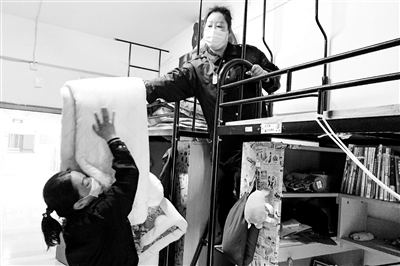 4月13日,扬州大学公寓中心宿舍管理员在给学生晾晒被褥。随着疫情防控形势逐渐向好,该校开始学生返校复课的各项准备工作,学生宿舍管理员将寝室中被褥编号后搬出晾晒,给即将返校的学生提供良好的生活保障。